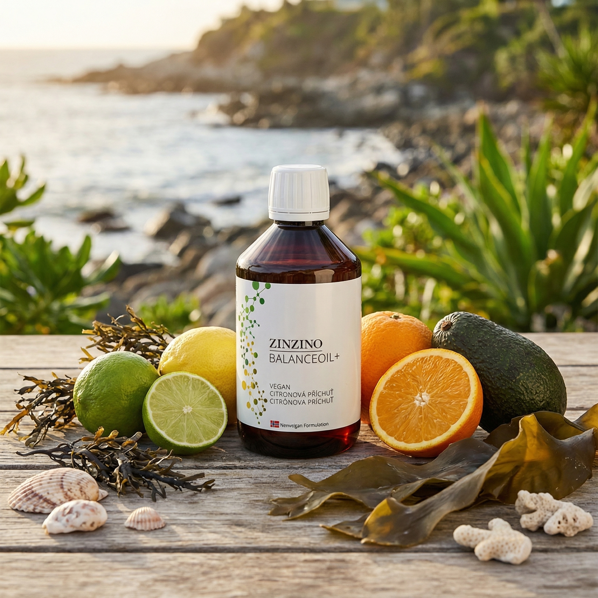 Citrónová příchuť: Olivový olej lisovaný za studena, olej z mikroskopických mořských řas Schizochytrium sp., rafinovaný olej ze semen rostliny Ahiflower®, příchuť (přírodní citronová příchuť), antioxidanty (extrakt bohatý na tokoferoly), vitamin D3 (cholekalciferol získaný z rostlinného výtažku)